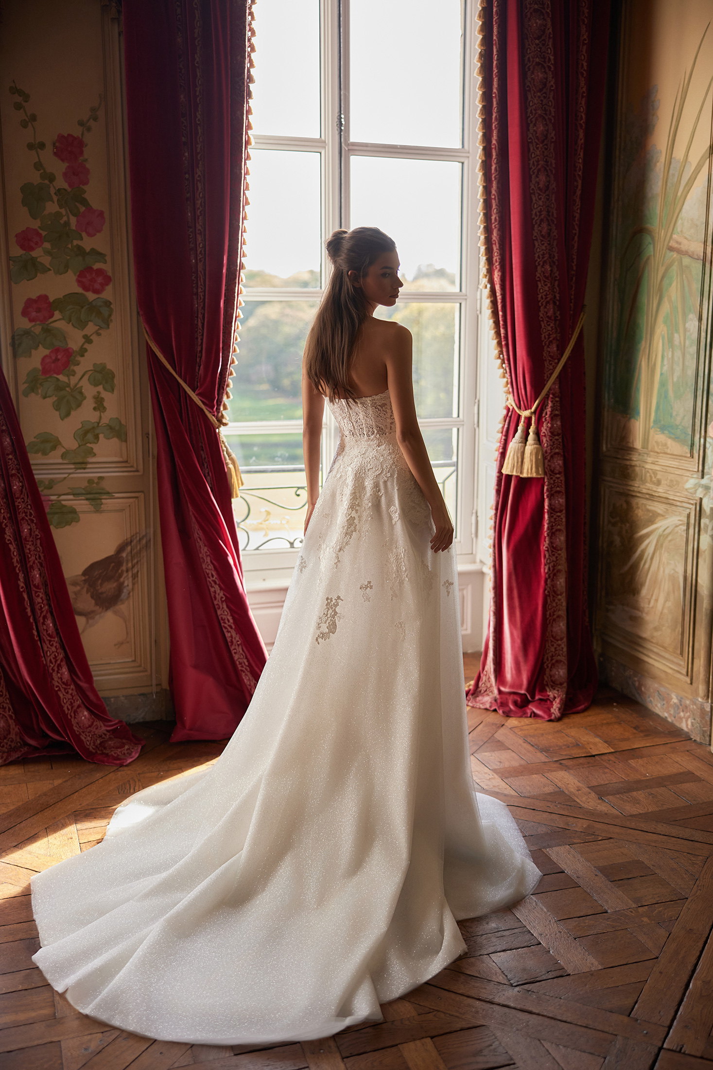 Vienna is a strikingly elegant gown designed to sculpt the figure with refined sensuality. The off-the-shoulder silhouette features a fully boned corset bodice with defined bust cups, tailored in allover Alençon lace layered over subtle glitter tulle for a soft, luminous effect and complemented by detachable lace sleeves. The fitted skirt continues in matching lace, flowing seamlessly into a delicate train. A detachable overskirt, tailored in dense glitter tulle and decorated with coordinating lace appliqués, adds dramatic volume and transforms the look for a statement entrance.